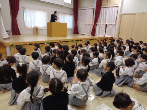 遠くからトナカイの鈴の音が響きます。 白鳥幼稚園にサンタさんがきました。 先生のマジックの出し物もあり大盛り上がり。 質問コーナーでは、みんな聞きたいことが沢山あったようです。 サンタさんからのプレゼントは一人ひとり手渡しでもらえました。 人見知りのある子はサンタさんと目も合わさずにプレゼントを貰っている姿もみられました。 お家でクリスマス会の話を聞いてみてくださいね。 |