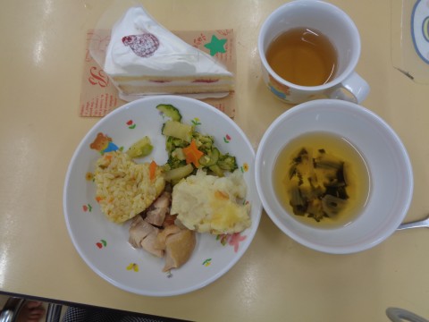 今日は誕生会メニューです。 年少さんは給食の味にもだんだん慣れてきました。 《本日のメニュー》 ・わかめごはん ・鶏の唐揚げ ・ブリッコリーのおかかあえ・ ベークドポテト ・豆腐とえのきのみそ汁 ・ゼリー |