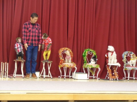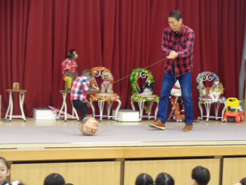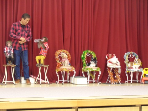 スーパードッグ&モンキーサーカスの皆さんが勢ぞろい! 昨年も見たことを覚えていた子は「おさるのひまりちゃん・かぐらちゃんが来た~」と大喜び。 お話しを聞いて頷いたり、分からない~と首を振ってみたり。 手を挙げてお返事もできます。音楽に合わせて踊りもできる様子を見た子ども達は目が釘付け。 ペットボトルのまま水が飲めるお猿さんにはビックリでした。 可愛い犬も4匹。バーを跳んだり、整列して歩いたりまるで人間のようでした。 楽しいショーでした。 |