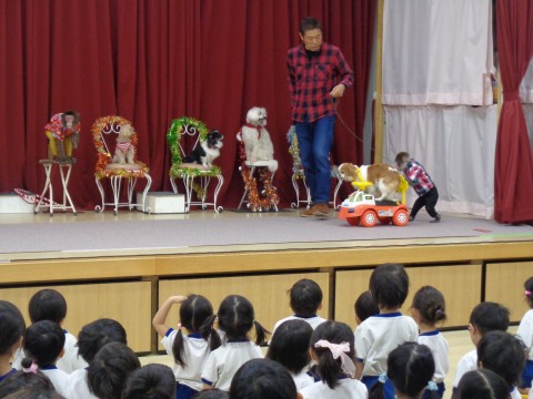 今日はスーパードッグ&モンキーサーカスショーを鑑賞しました。 お猿さん2匹(ひまりちゃん・神楽ちゃん) 犬4匹(ヒツジちゃん・レモンちゃん・キャニーちゃん・マ―ちゃん) 皆の前で沢山の得意技を見せてくれました。 動物たちの可愛い姿にみんな釘付け♥ ショーの後に触れ合う時間もありました。 【先生のコメント】 ・犬や猿の芸に子ども達は終始「お~!」と驚き楽しんでいました。犬が車に乗りそれを猿が押すところや竹馬に乗ったところなど一人一人印象に残ったようです。 ・犬や猿を見た子ども達は「犬だね~」など話す姿や、2本足で歩いてる犬の姿を見て、とてもびっくりしたようで「え!犬って歩けるんだ」と話す姿もみられました。 |