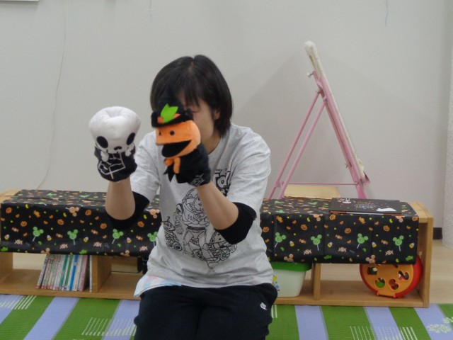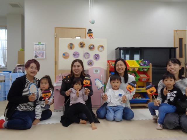肌寒い日となった今日。お部屋で自由に遊んだ後は、おはなしランドの時間‼ハロウィンの絵本を見たりカボチャおばけ等のスティックを選んでパネルシアターに参加♡お友達も保護者の方も一緒にスティックをふりふりさせてくれました♬ 少しでもハロウィンを味わえてもらえたら嬉しいです。 寒い日が増えてきましたが、風邪等をひかないよう気を付けて下さいね‼ 11月も元気にちゃおちゃお広場で遊びましょう。  |