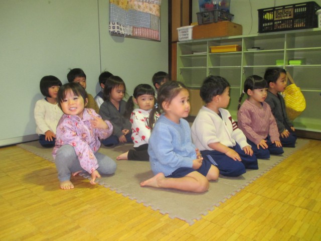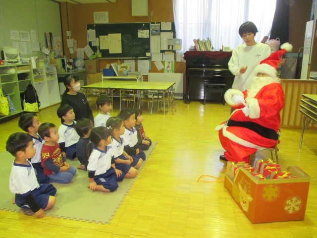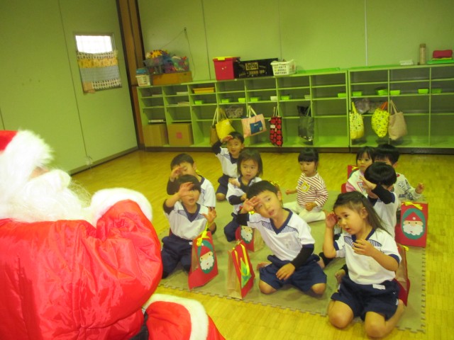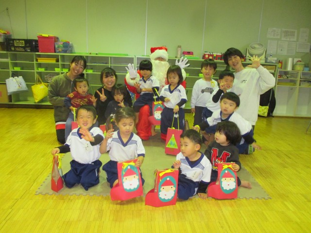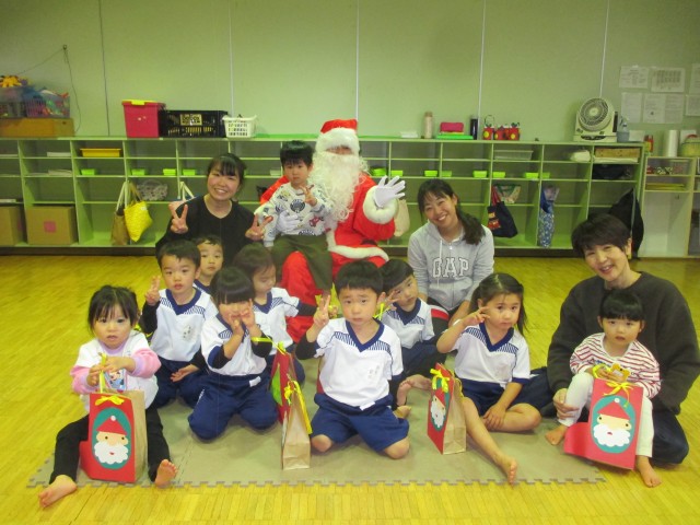 12月も寒さに負けず元気一杯の子ども達です。 先週は、一足先にお楽しみ会がありました。サンタさんが来ることを伝えると、「えー!!」と驚く姿がありました。サンタさんが登場すると、終始サンタさんに夢中となり、目を輝かせていました。質問コーナーでは、「いちごは好き?」「バナナは好き?」など、可愛らしい質問が飛び交いました。一人ひとりプレゼントを頂いて、とても嬉しそうでした。 最後はみんなで、きらきら星の歌をサンタさんに感謝の気持ちを込めて、プレゼントをお返ししました。 サンタさんが帰ると、寂しさと悲しみで、涙もありましたが、「またね!!」と、さようならをしました。来年も来てくれますように。。。 来年のナーサリィの新規募集を受け付けています。お電話お待ちしております。 |